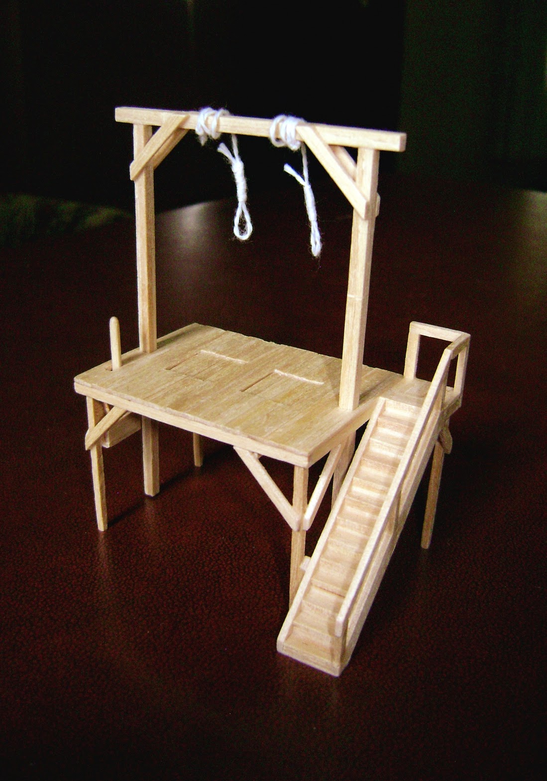 This is a gallows of my own design that i am scratch building from wooden craft sticks. Means of releasing the trap door. 1 attach hinges to the trapdoor and attach a ratchet and lever to it and the floor of the stand so it can be lever released. Four bar counterweight mechanism for trap door duration.