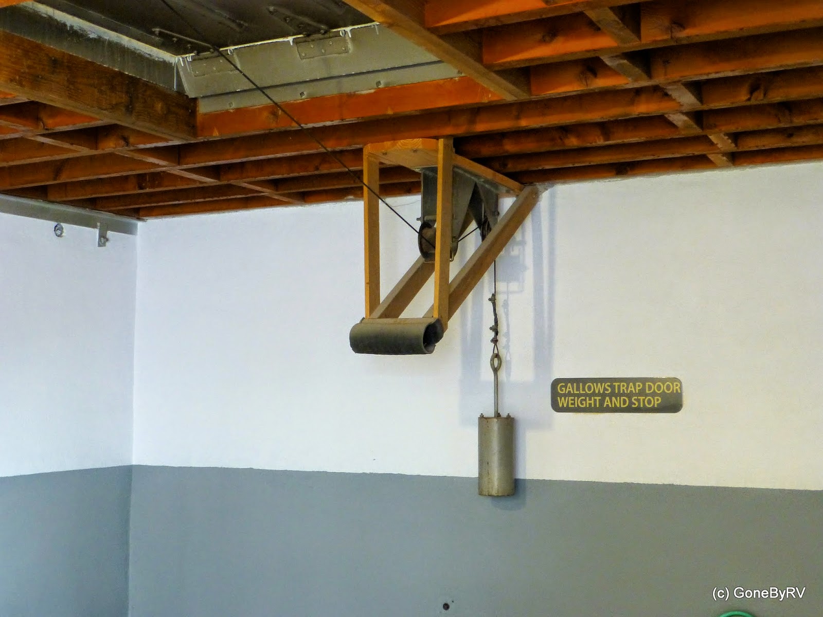 This is normally accomplished by utilizing two bolts under one side of the door which are actuated by a common mechanism either linkage rods or cable. Prior to any execution the gallows area trap door and release mechanisms are inspected for proper operation. The present day gallows in washington s walla walla prison looks most unlike this traditional pattern consisting simply of two massive iron eye bolts through which the rope passes each set over a single leaf trap operated by an electromagnetic release mechanism. Gallows model on display at the historical society mankato mn duration.